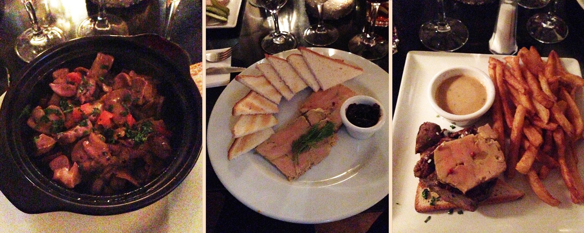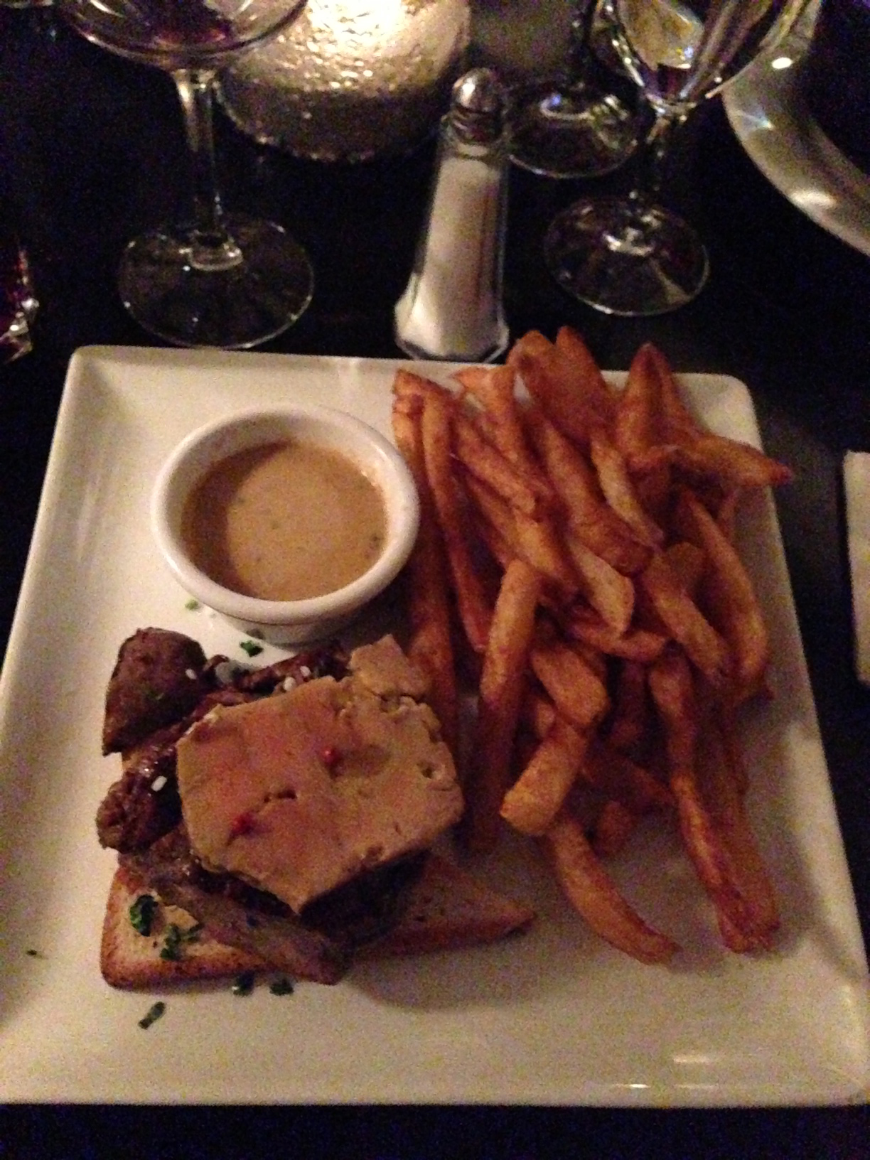 Franchement pas convaincu. La terrine du chef est assez fade mais se mange simplement avec un bon pain. J’ai enchainé avec « une pièce de bœuf façon rossini » servi sur un toast avec donc du foie au-dessus. La viande était beaucoup trop cuite et de qualité correcte accompagnée pour le coup d’excellentes frites maison. Les plats et entrées ont le mérite d’être copieux, cela, on ne peut pas le retirer. Mon estomac n’avait plus suffisamment de place pour un dessert complet, j’ai donc opté pour « un café gourmand » copieux lui aussi mais pas incroyable gustativement parlant. Il était composé de crèmes chocolatées assez écœurantes, d’une part de tarte ananas sympathique et d’un excellent petit gâteau à l’amaretto semble-t-il.