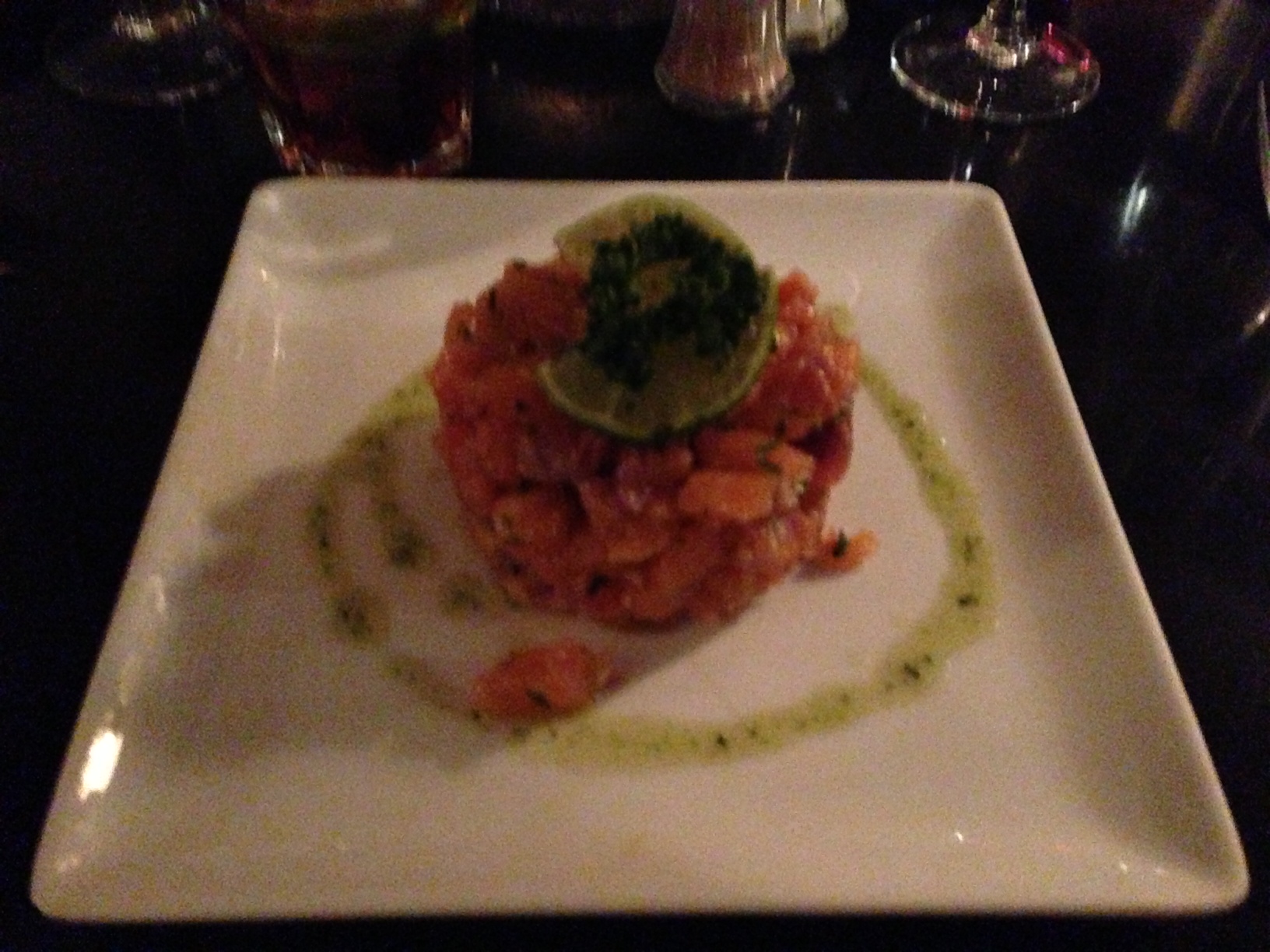 Pour commencer, j’ai choisi de prendre tous les plats « faits maison ». J’ai donc commandé un « mi-cuit de foie gras », qui s’apparentait plus à un foie gras normal qui a pris un coup de chaud sur le bord du fourneau. A ma grande déception, j’ai tout de même dû retirer 2 nerfs de celui-ci. Servi avec du pain de mie « Harris » coupé en triangle et une confiture de cerises noires, fade et insipide.